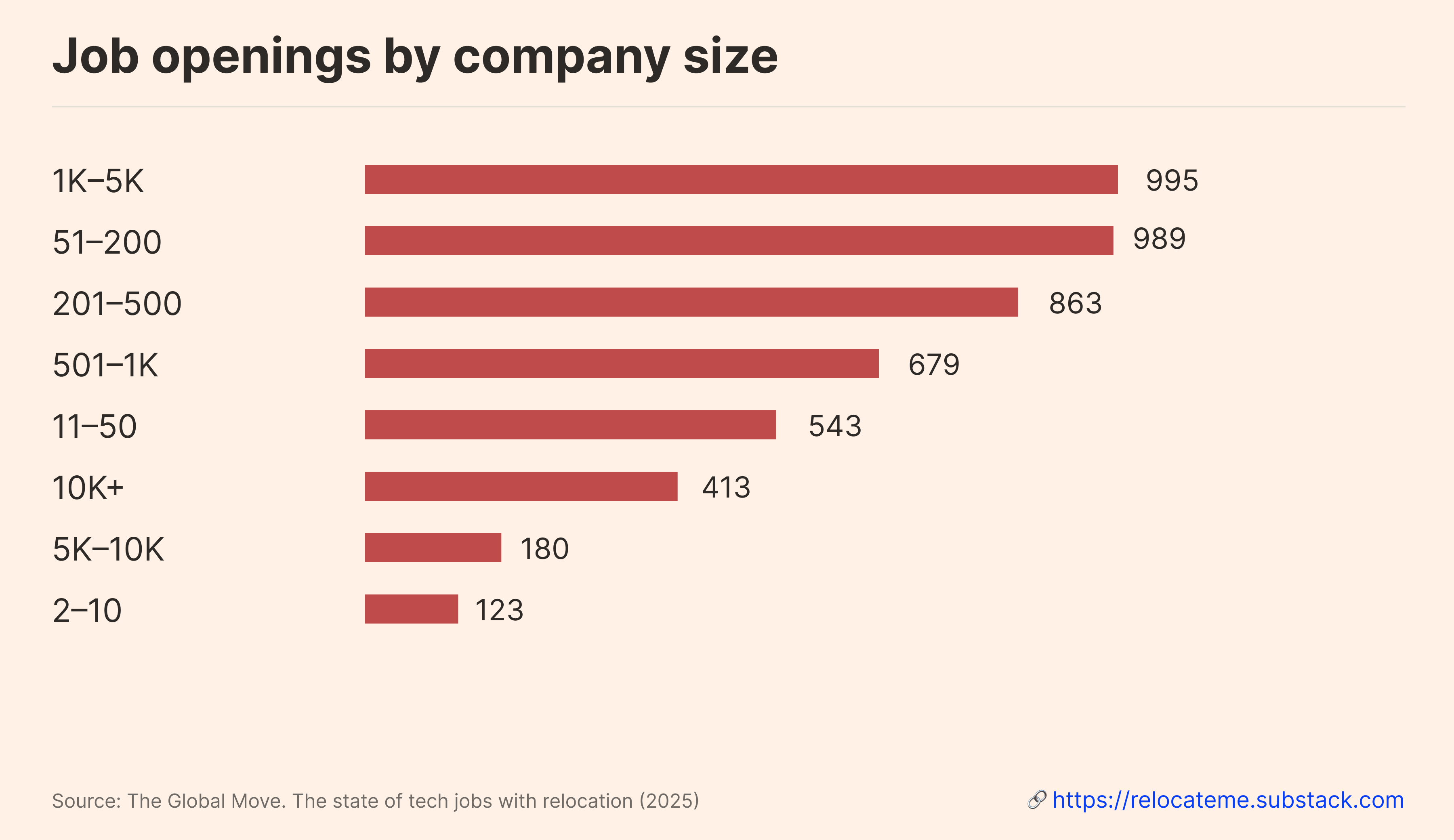 Instead, scale-ups and mid-sized companies represent the majority of opportunities. These companies often grow faster, have more hiring options, and have more talent shortages in their home markets. I recently ran a guide on how to prepare for applying for a relocation-friendly job at least 6 months before clicking “submit.” If you go over and read it, you’ll notice quickly that most of those strategies might work better in mid-sized companies than with cluttered, swamped MAANG recruiters. So this is actually encouraging data.