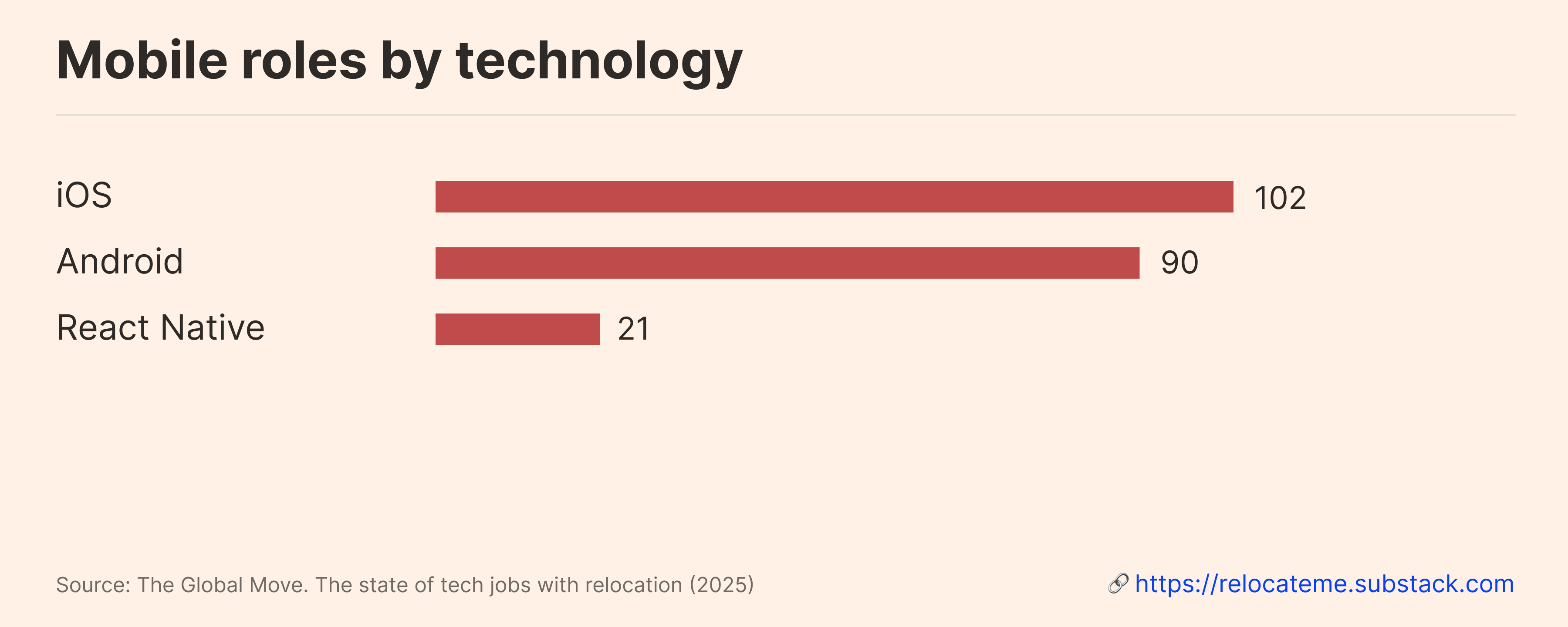 iOS (102 mentions) slightly outpaces Android (90) in mobile job titles, with React Native appearing in 21 listings.