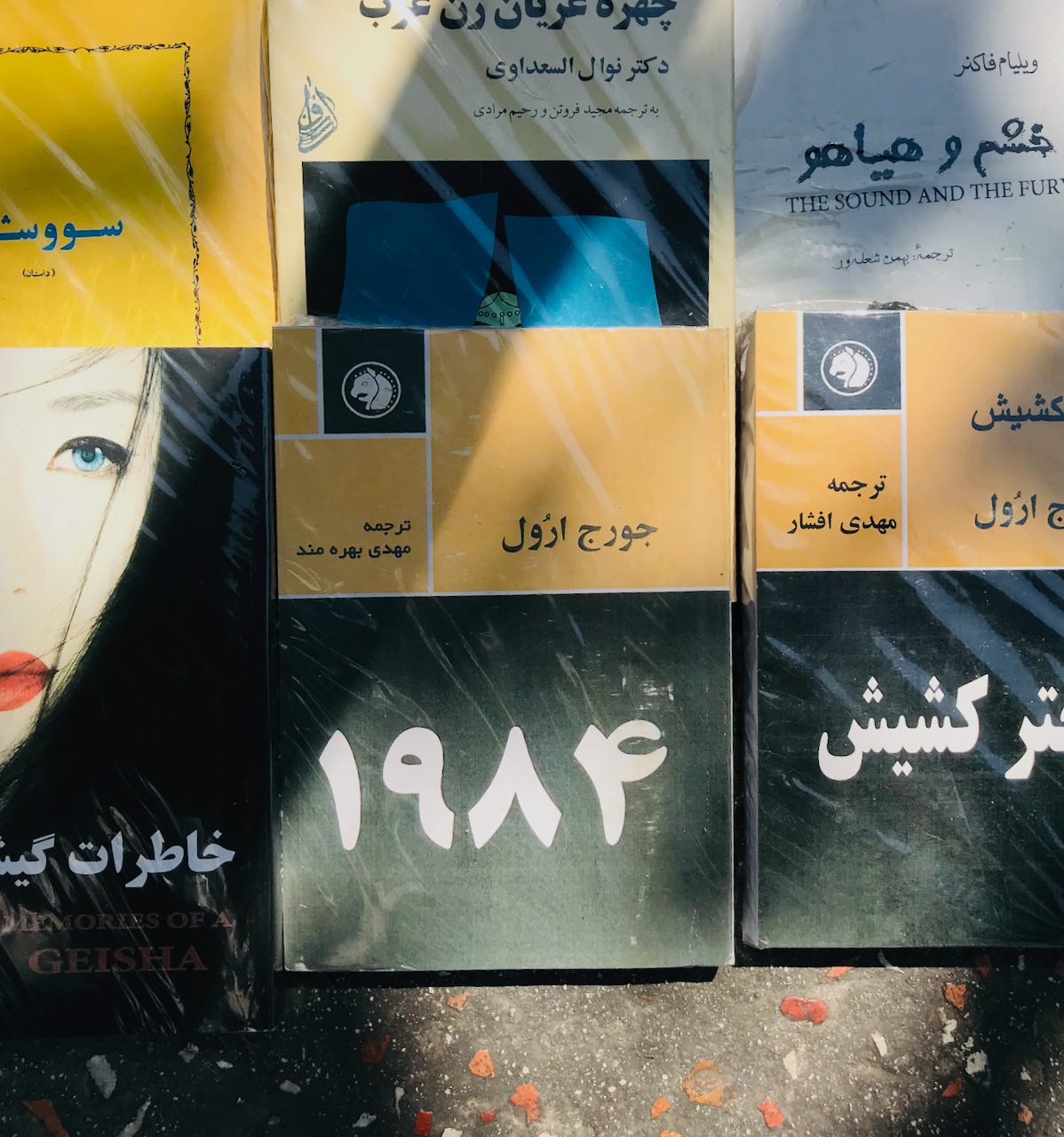 Here we see The Sound and the Fury, Memoirs of a Geisha, and 1984. The latter was probably the most frequently-sold book that I spotted in the entire neighborhood. The title at top is a Farsi translation of a book by the Egyptian feminist writer Nawal El Saadawi about female genital mutilation and the oppression of women called The Hidden Face of Eve.