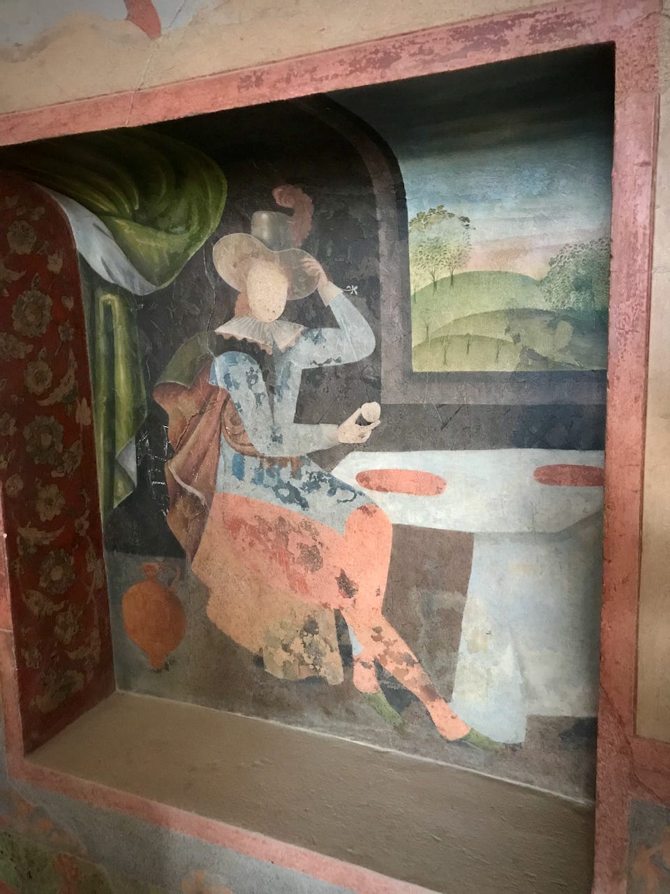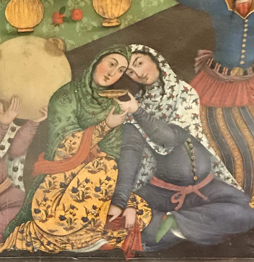 In addition to the wine-drinking on display throughout the murals in the complex, there is also at least one detail which may depict a truly risqué scene for any early modern artist: two women who may be depicted as lovers. (For more on this painting and the culture that produced it, see Afsaneh Najmabadi’s Women with Mustaches and Men without Beards).