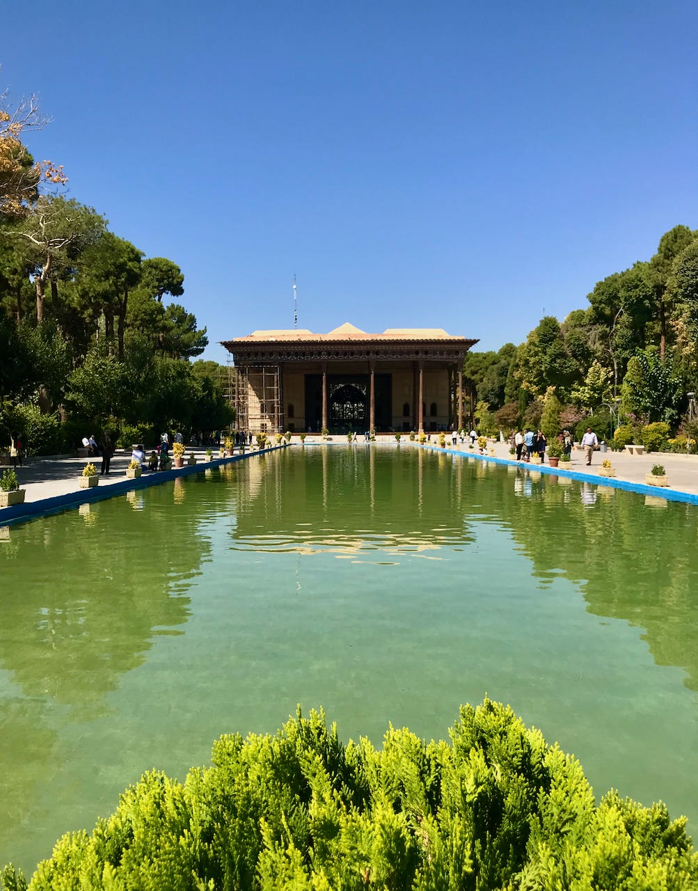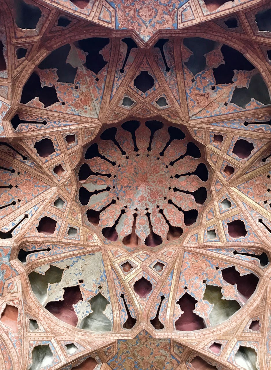Ali Qapu Palace, one of the imperial seats of the Safavid Emperors, looks out over the square with a commanding view. But more beautiful, I thought, was the Chehel Sotoun (“Forty Columns”) royal complex, which had both extraordinary architecture (more amazing ceilings) and some richly mysterious and evocative early modern wall paintings.