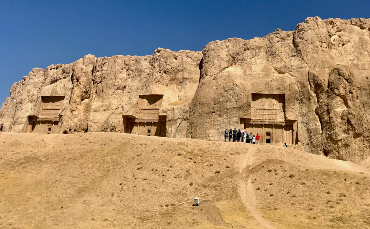 Not far from Shiraz is the world-famous ancient Persian palace complex of Persepolis, as well as the less-famous but equally interesting Naqsh-e Rostam, the burial site of four Achaemenid emperors including Darius the Great.