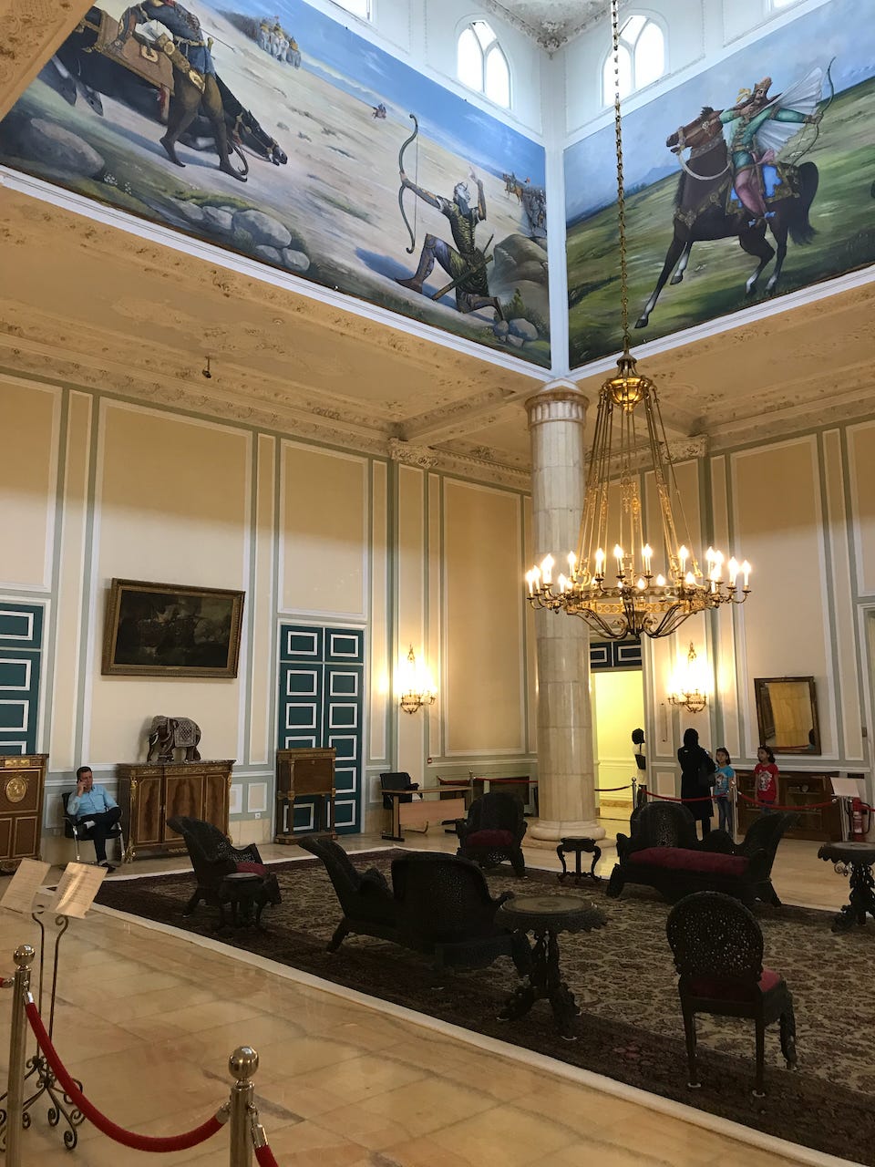 The Shah’s palace in Tehran was one of the more moody and haunted-feeling places I’ve been. It preserves, seemingly more or less intact, the artifacts of the Iranian royal family on the eve of the 1979 Revolution, complete with faded 1970s-era recliners, fluorescent lighting, and other accoutrements of an aging couple. The grander, more public-facing halls and ballrooms feature paintings from Iran’s national epic, Shahnahmeh.