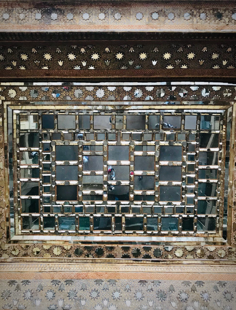 The ceilings were a mixture of inlaid/painted wood and cut glass mirrors.