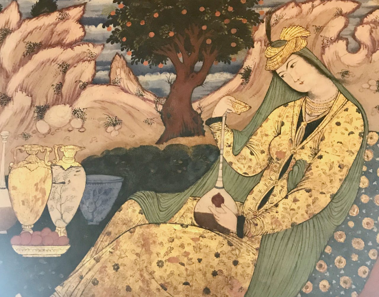 A detail of dancers and musicians in the painting of Abbas II entertaining the King of Turkestan. I am guessing that it may be Yalda night due to the prominent watermelon, but I might be wrong.