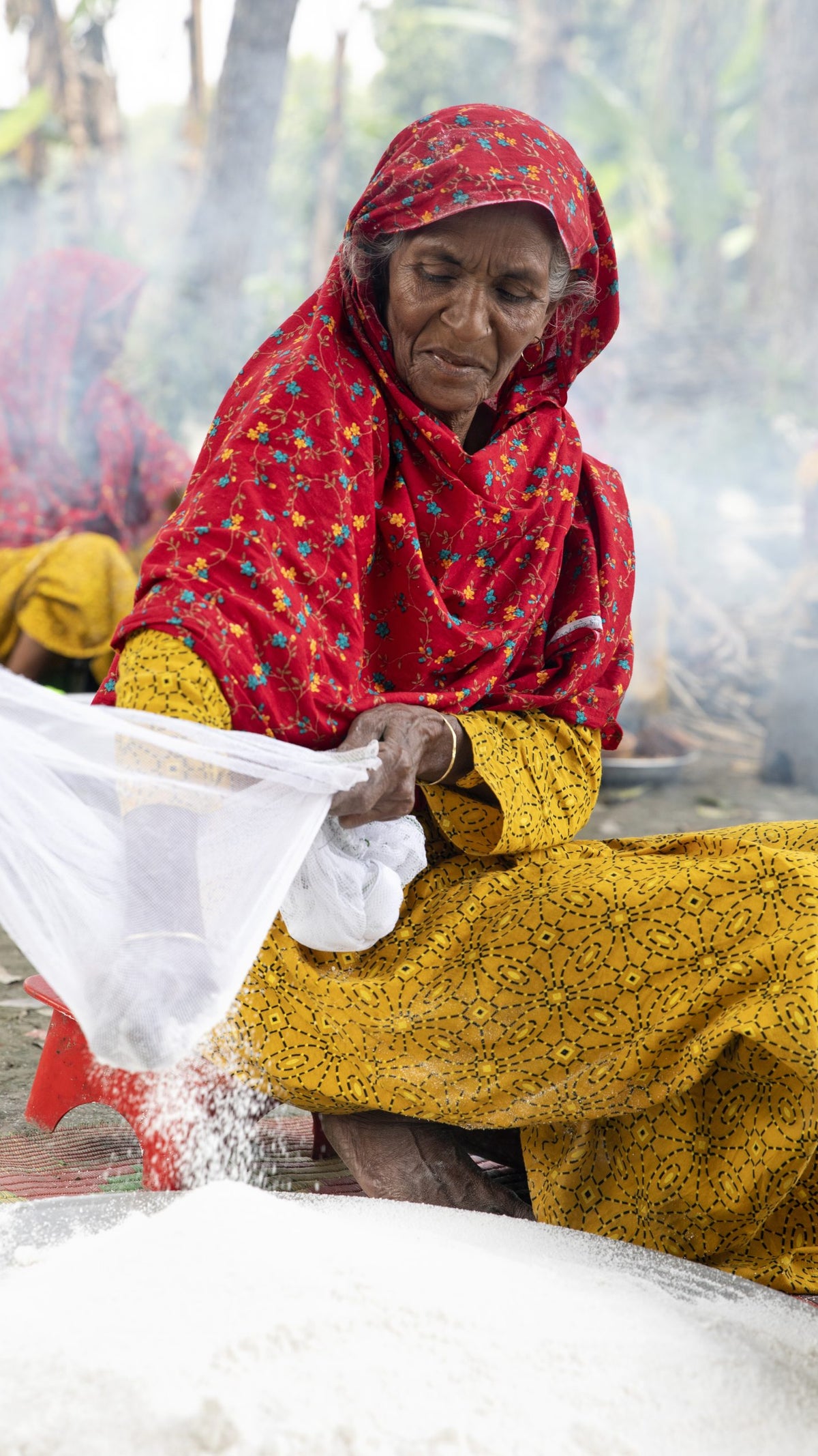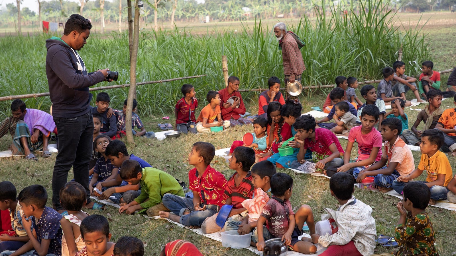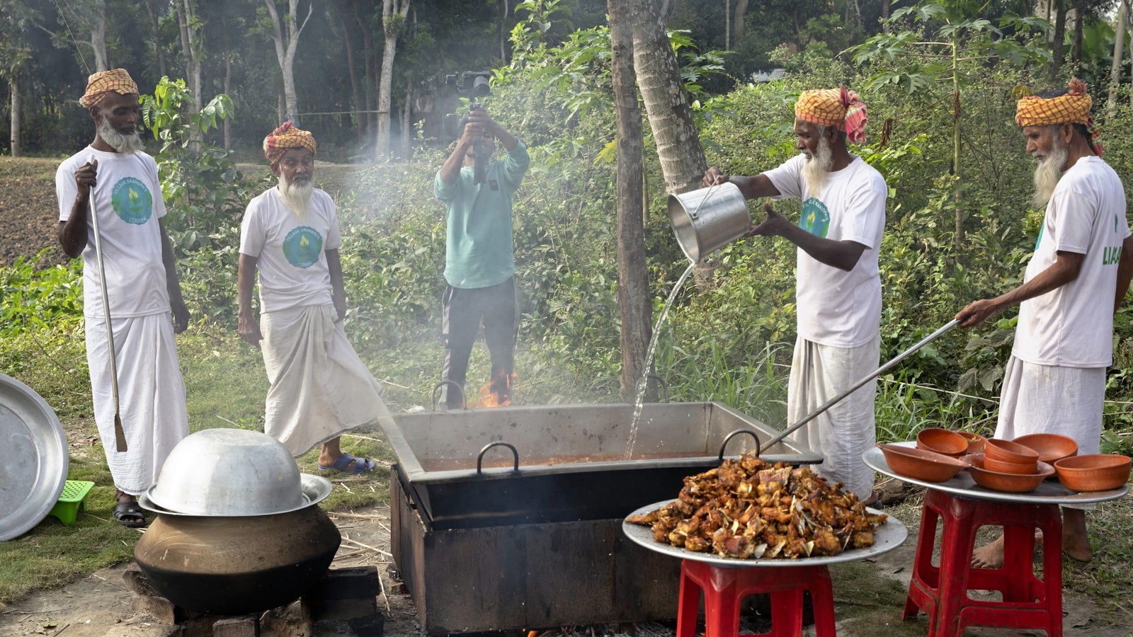 Over the last four years, the channel has adopted a rustic, practical visual style; it uploads about eight videos a month and has a cumulative 1.3 billion views. The eating videos have no “umms,” “ahhs,” or slurping noises to impress upon the audience an orgasmic food experience, typical of travel-cooking shows. Khan says that authenticity is the cornerstone of the channel’s success. In a video uploaded in March 2021, ten Bengali women dressed in pink squat on an open field hacking away at a 234-pound monster tuna. The preparation takes hours: they fillet the tuna, chop it up into hundreds of tiny pieces and hold them up for the camera filming them. The stew is cooked over a wood fire on a large flat metal pan, the sizzle accompanied by Bengali chatter and the sounds of wind and bird calls. Then, the meal is dished out to over 400 guests seated cross-legged in an open field.