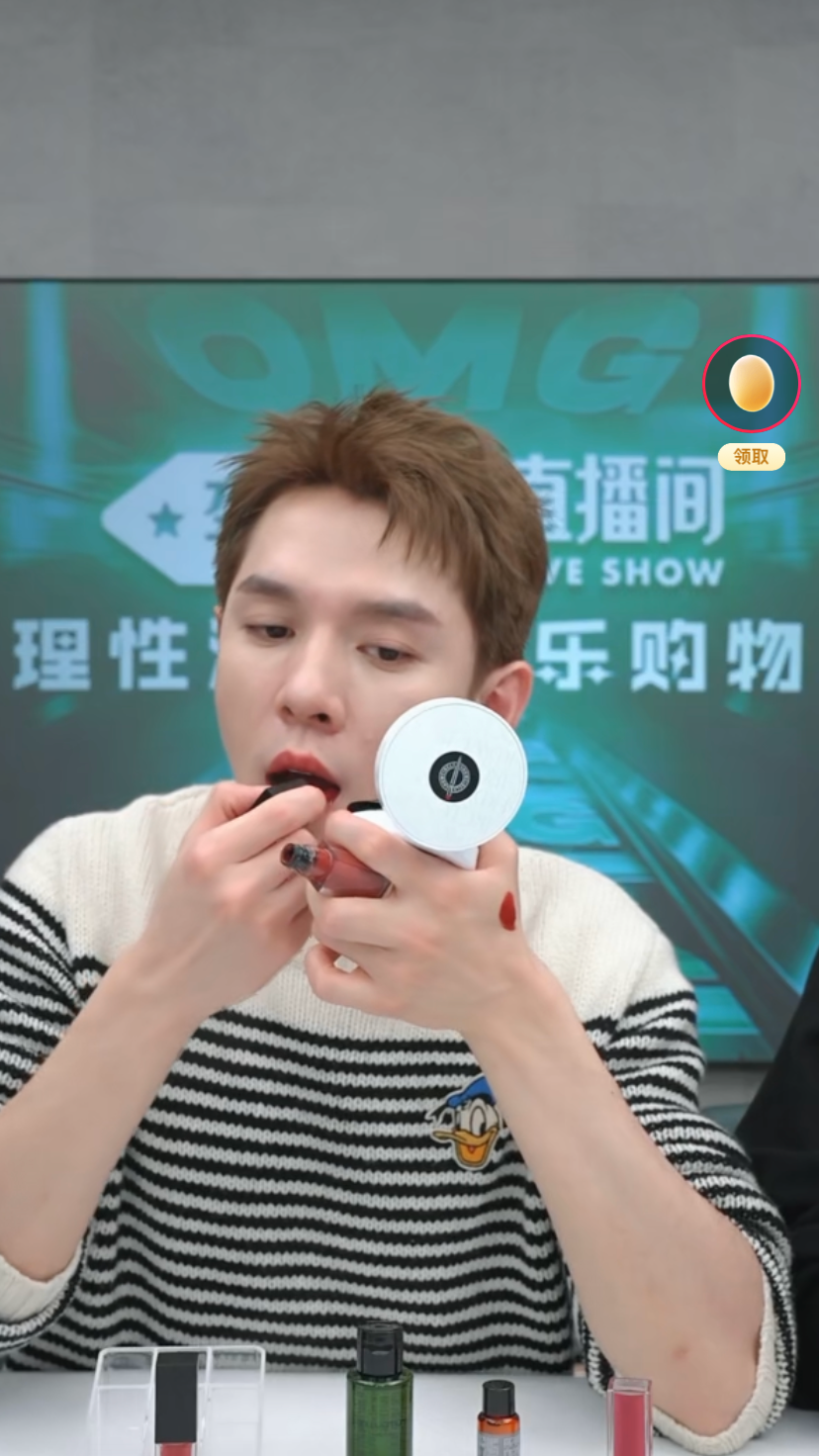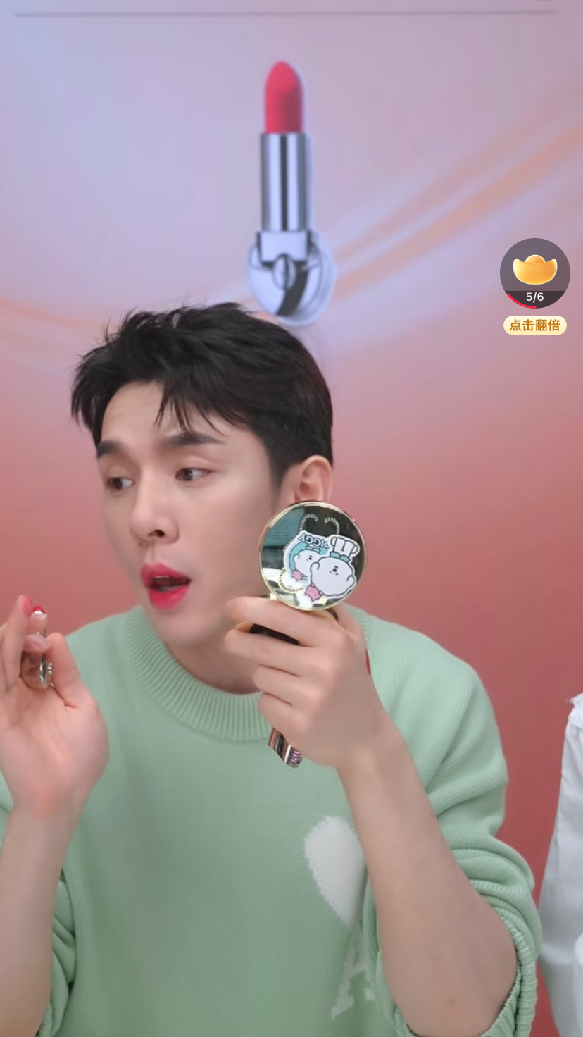 Trying out lipstick became a key part of Li’s online persona. Sitting in front of a wall of lipsticks, he would lean forward to showcase his newly adorned lips, and describe the products with exaggerated metaphors. “This is where people would say ‘there are little elves dancing on them,’” he said in a 2019 livestream, after putting on a YSL lip gloss. “There is the starry sky and starlight in it.”
