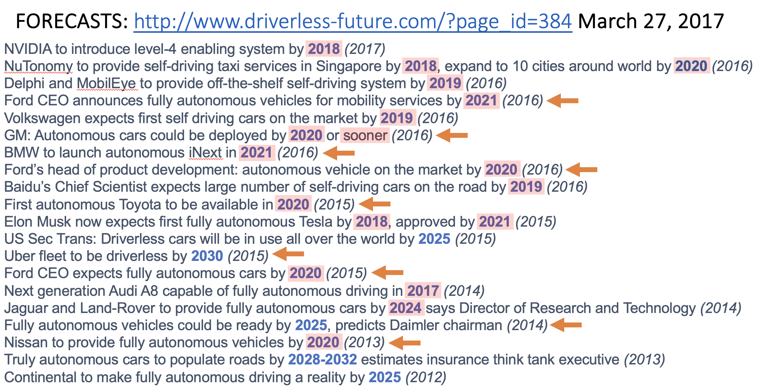 The prediction that Jaguar and Land-Rover made that they would have fully autonomous cars by 2024 did not come to pass, so I have shaded it pink,