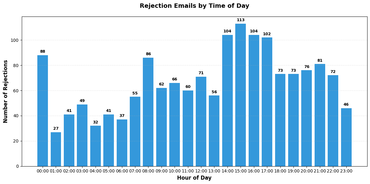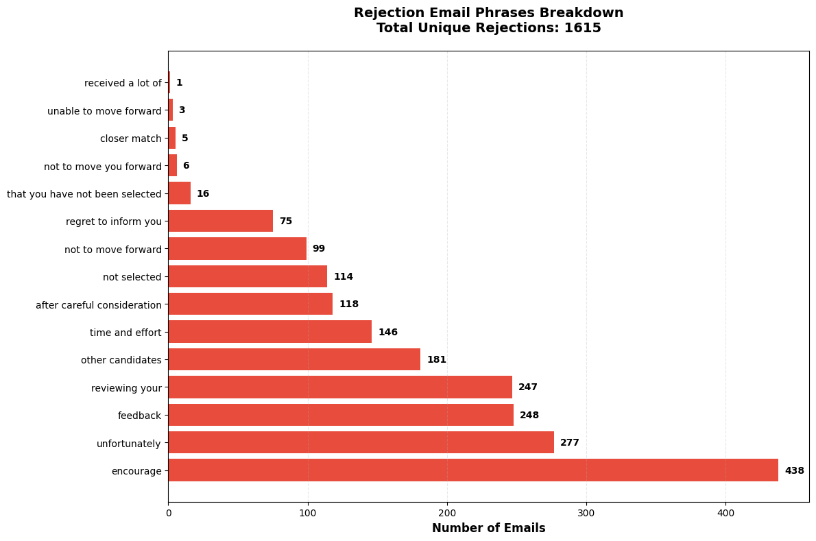 In analysis.py I currently have breakdown of the commonly used phrases, the sender usernames and the times during which I received the rejections. The commonly used phrases and sender usernames make sense and the results are also well expected. We have words like ‘encourage’ and ‘unfortunately’ dominating the phrases.