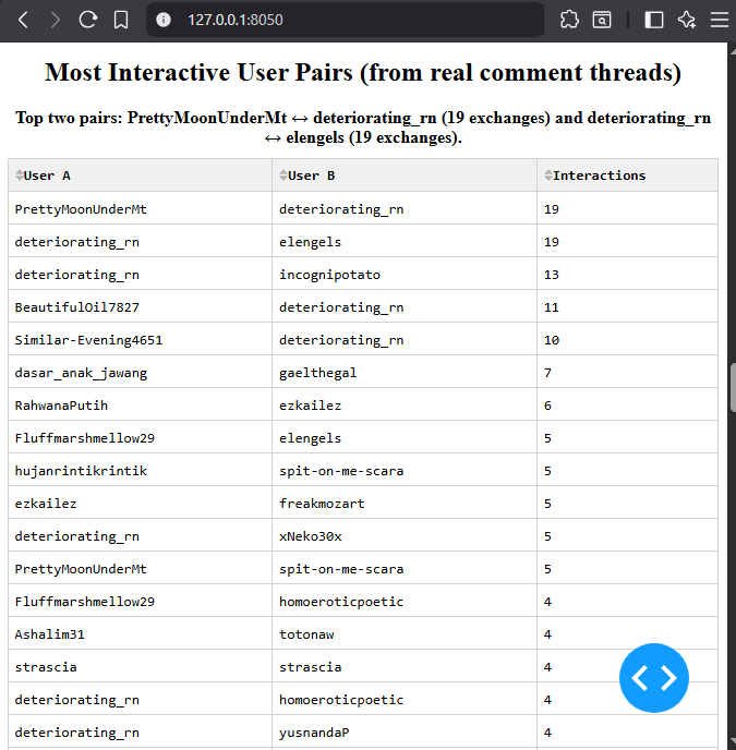 Run the script, and you’ll get an interactive dashboard showing the evolving social web of a Reddit thread — where every comment becomes a connection and every discussion forms a cluster.