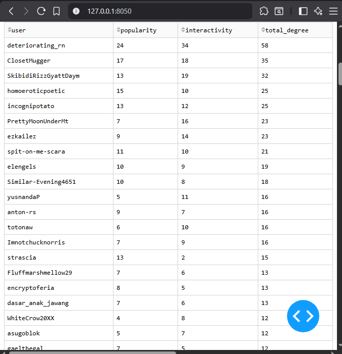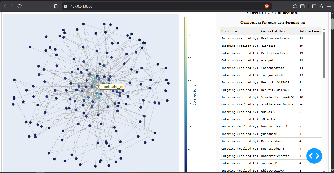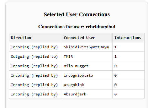 The visualization isn’t static. You can click on any node to explore its details — who the user interacted with, and how strong each connection was. Connections are sorted by their interaction depth, giving a rough idea of who’s socially closest to whom.