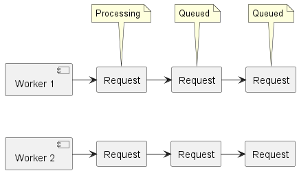 Keeping requests queued up ensures that we never leave a worker without work to do while also allowing us to measure whether all workers are processing requests at a consistent rate. The P95 request latency metric will tell us how well balanced our queues are – large P95 latencies will indicate that some queues are slowing down and not keeping up as well as others.