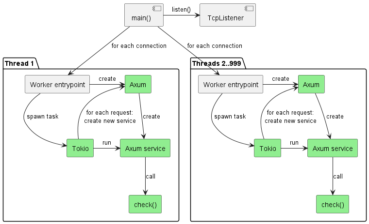 We leave the main() entrypoint thread to process incoming connections and hand them off to workers. Meanwhile, in each worker we create an entirely independent Axum app on thread startup, which we use to serve incoming requests from connections assigned to that worker, by creating a request-specific Axum service for every request (same as Axum does internally in its default configuration).