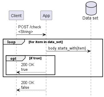 The algorithm is very simple: check if the request body starts with any of the strings in our data set. In our benchmark scenario this comparison will never match, so every request will search the entire data set, giving us consistent behavior under benchmarking.