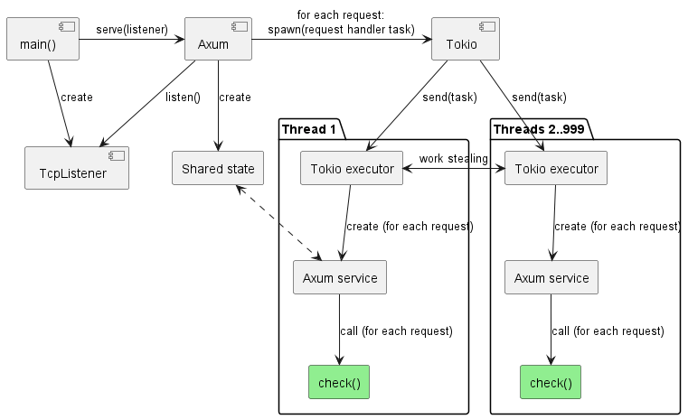 A typical Rust web app is hosted on a Tokio async task runtime that manages one worker thread for each processor in the system. On top of these is a web application framework like Axum, which manages a router, holds shared application state and uses Tokio to dispatch request processing work to request handlers created by the service author.