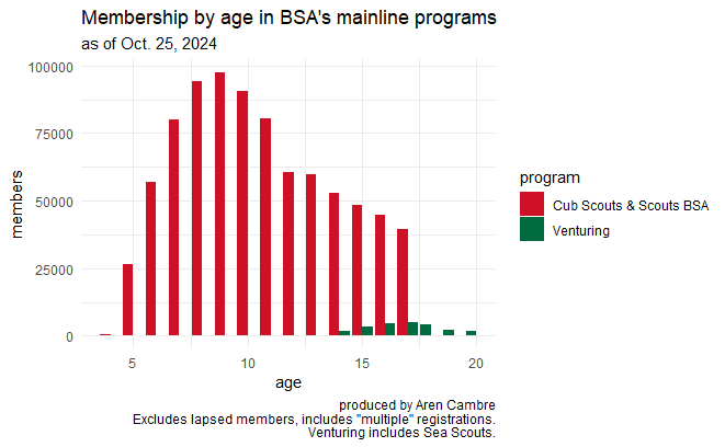 - Scouts BSA is a middle-school program. I therefore expect high rates of attrition for new, older middle schoolers, who are joining a program they will quickly outgrow, or for high schoolers, who are infantilized by a program designed for the prior age cohort. ↩︎