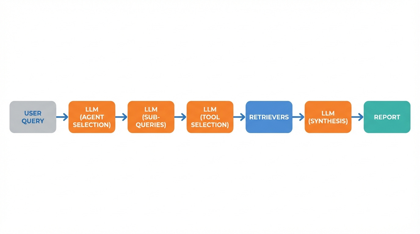 It uses LLM calls to decide which agent to run. It uses LLM calls to generate sub-queries. It uses LLM calls to select tools. It uses LLM calls to coordinate parallel work.