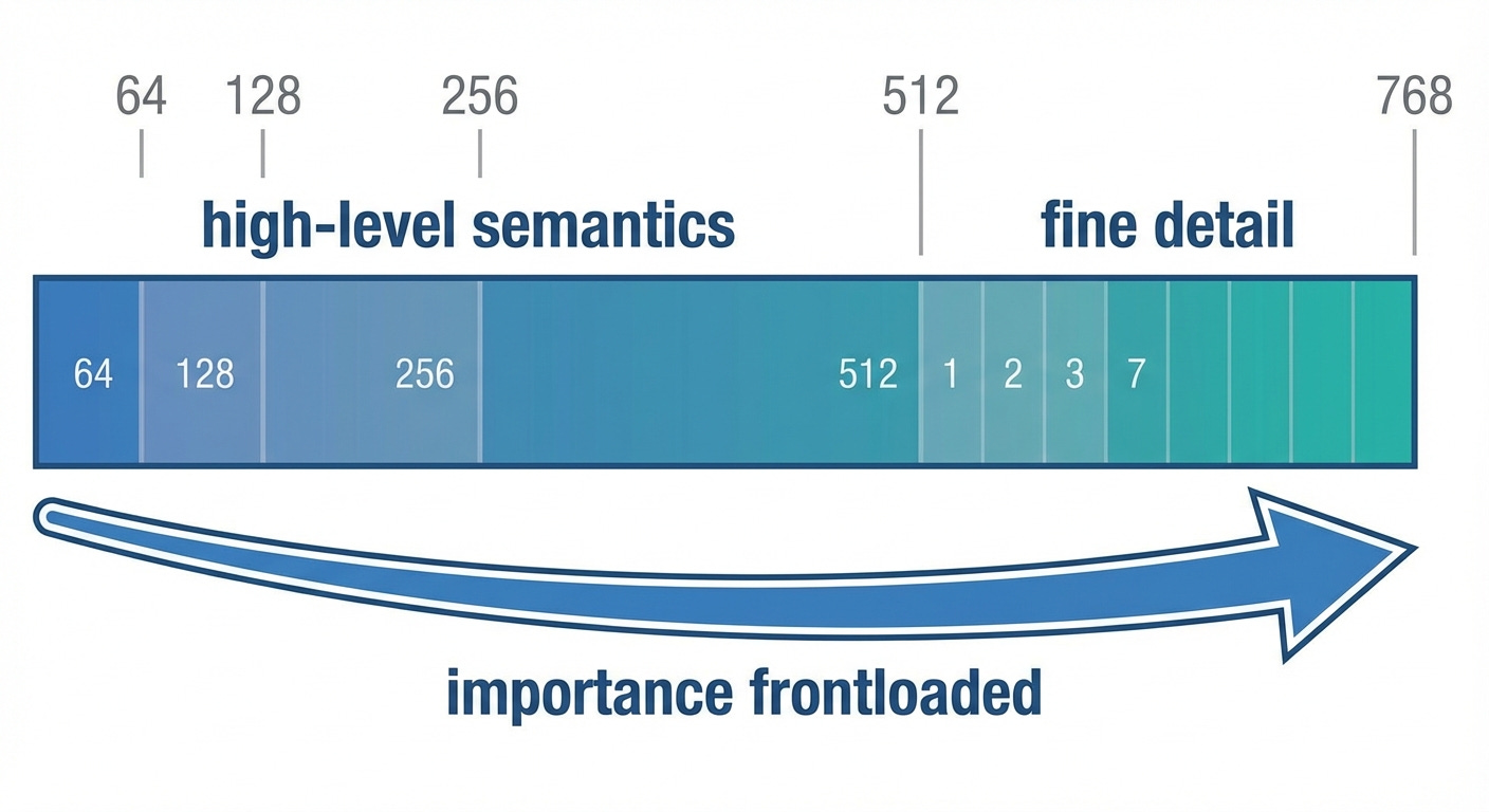 The result: you can slice an MRL embedding at any of the trained dimensions and get a working representation. The first 64 dimensions capture coarse semantics. Adding dimensions refines the representation progressively.