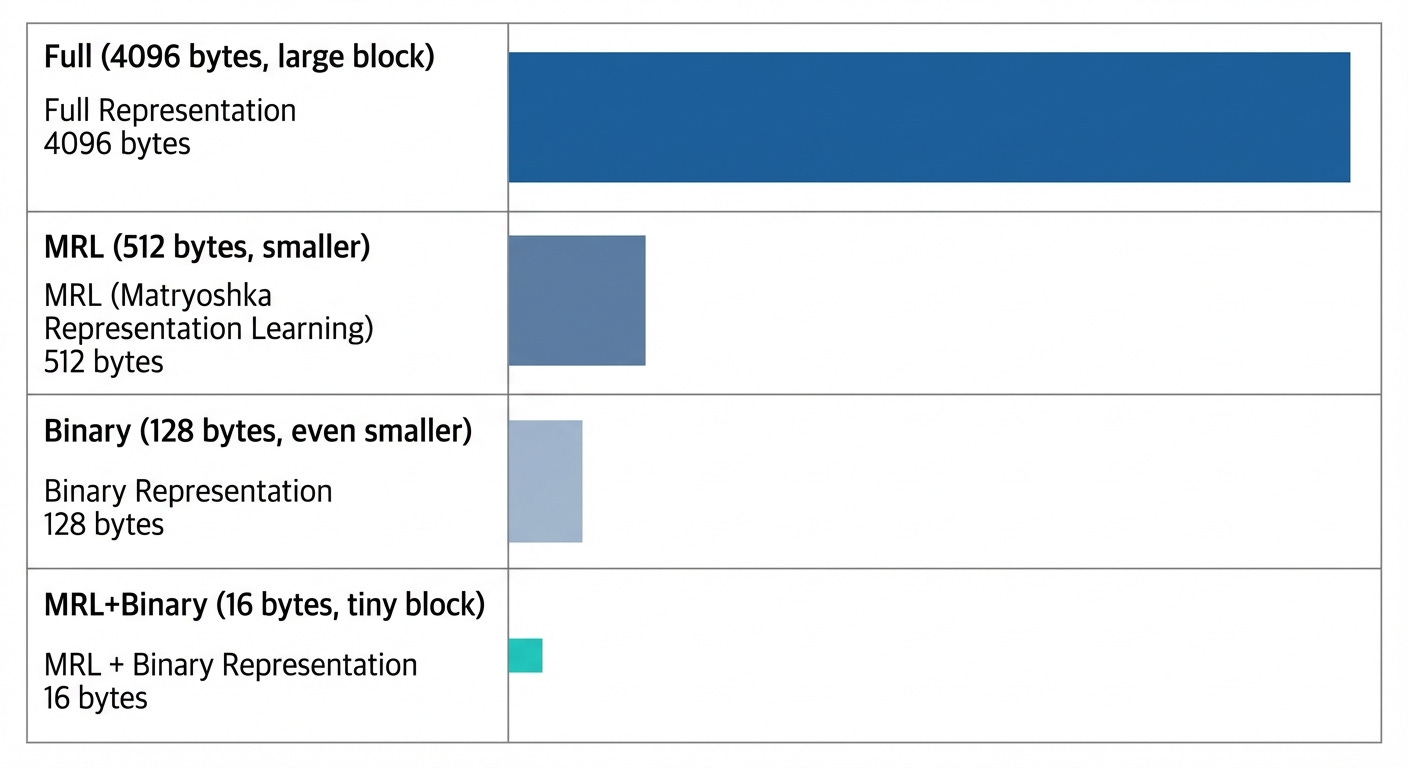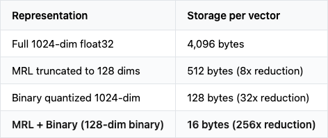 The tradeoff: binary quantization loses more accuracy than MRL truncation. A reasonable production setup might be:
