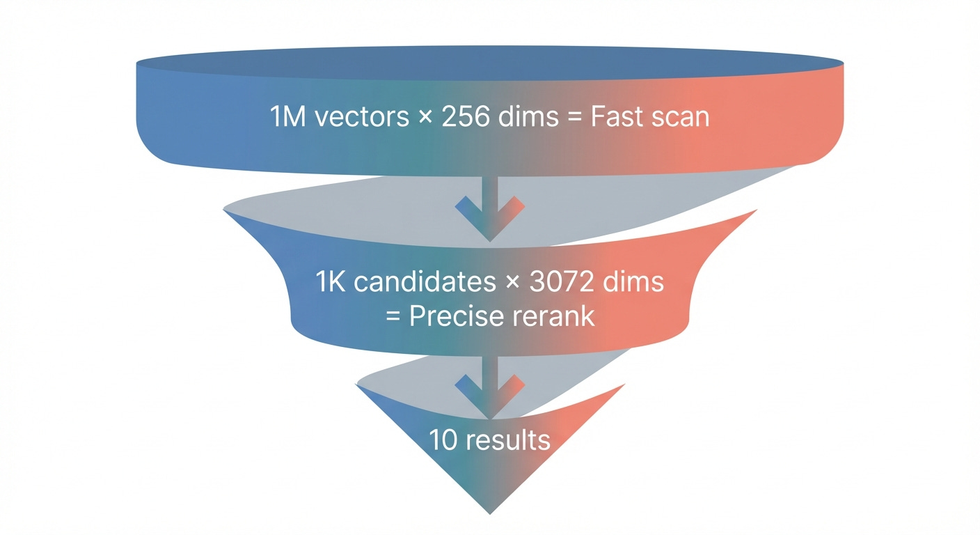 Stage 1 (Fast, Broad): Search using truncated embeddings (say, 256 dims) to find 1,000 candidates quickly.