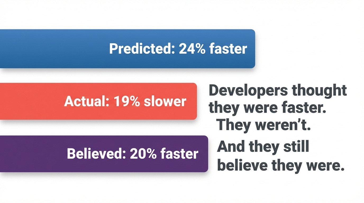 In the METR study, developers predicted AI would make them 24% faster before starting. After finishing 19% slower, they still believed they'd been 20% faster.