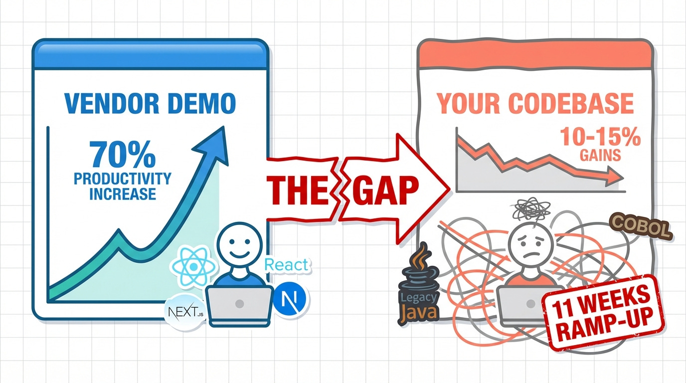 They hallucinate solutions that look plausible until they hit production. They suggest refactors that would take six months of human work to validate. And when leadership asks why you're not seeing the 70% gains, you're stuck explaining that the vendor demos didn't include 15-year-old Java monoliths held together with duct tape and prayers.
