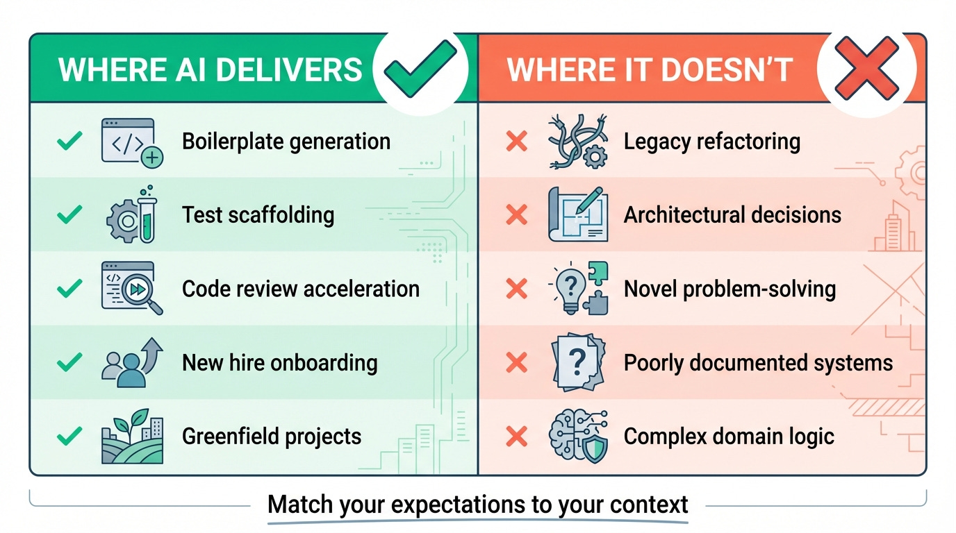But the next time a vendor tells you AI will 10x your team, ask them one question: "Show me the enterprise teams running legacy systems who got those gains."
