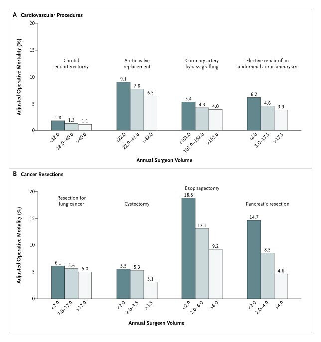 Complex procedures show 2-3 times higher mortality when performed by low-volume surgeons versus high-volume specialists. Specialization is a proxy for volume; volume drives pattern recognition and better outcomes. Surgeon mortality rates are inversely related to case volume across all procedures—the adjusted odds ratio for operative death ranges from 1.24 for lung resection to 3.61 for pancreatic resection when comparing low-volume to high-volume surgeons.
