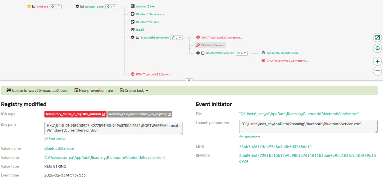 In this case, a clear sign of malicious activity is gaining persistence through the autorun mechanism via the Windows registry, specifically the Run key, which ensures that programs start automatically when the user logs in. KEDR Expert detects this activity using the temporary_folder_in_registry_autorun rule.