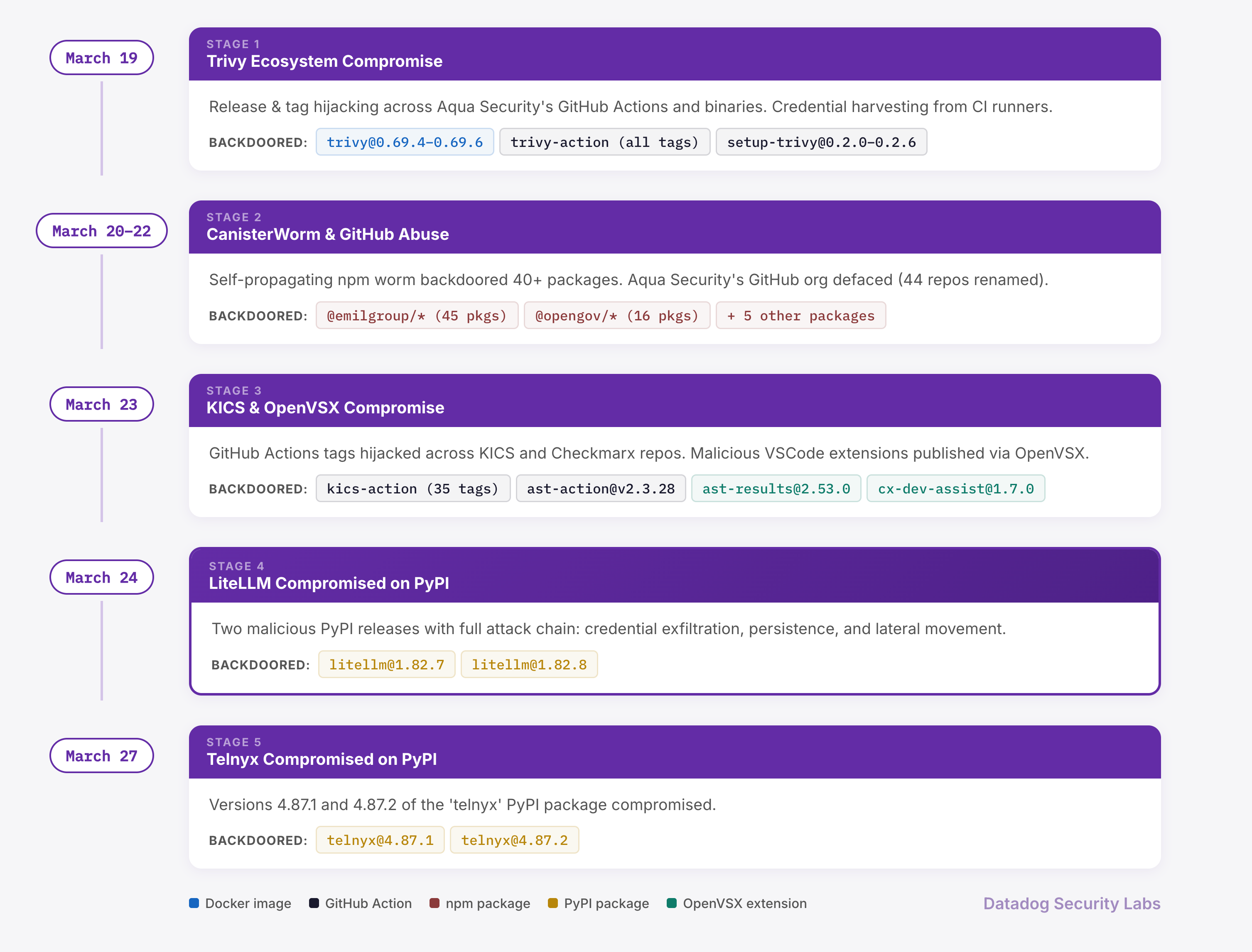 1.82.7and1.82.8, were published with malicious code as a result of a supply chain compromise. PyPI later quarantined the project. On March 27, two releases of thetelnyxpackage,4.87.1and4.87.2, were also backdoored. - Datadog Security Research's investigation links these compromises to a broader campaign that began with the March 19 Trivy compromise, continued with CanisterWorm on npm, and then reached Checkmarx KICS and related artifacts.