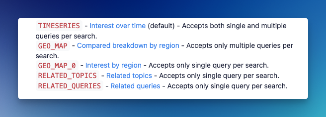 - Trending Searches: returns data for the latest trending searches shown on Google Trends' Trending Searches section.