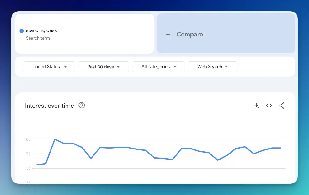 pytrend.build_payload(kw_list=['Standing Desk'])Inside the build_payload method, we can put the keywords list in an array.
