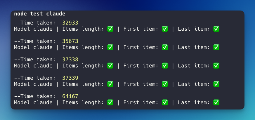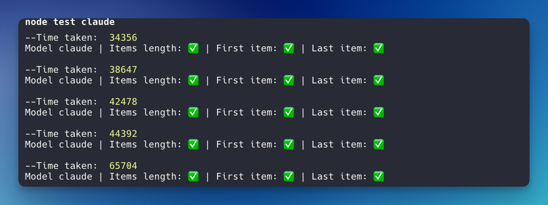 The average time taken for Claude is 43,302 milliseconds with 0/30 mistakes. 🤩🤩🤩 Perfect score!