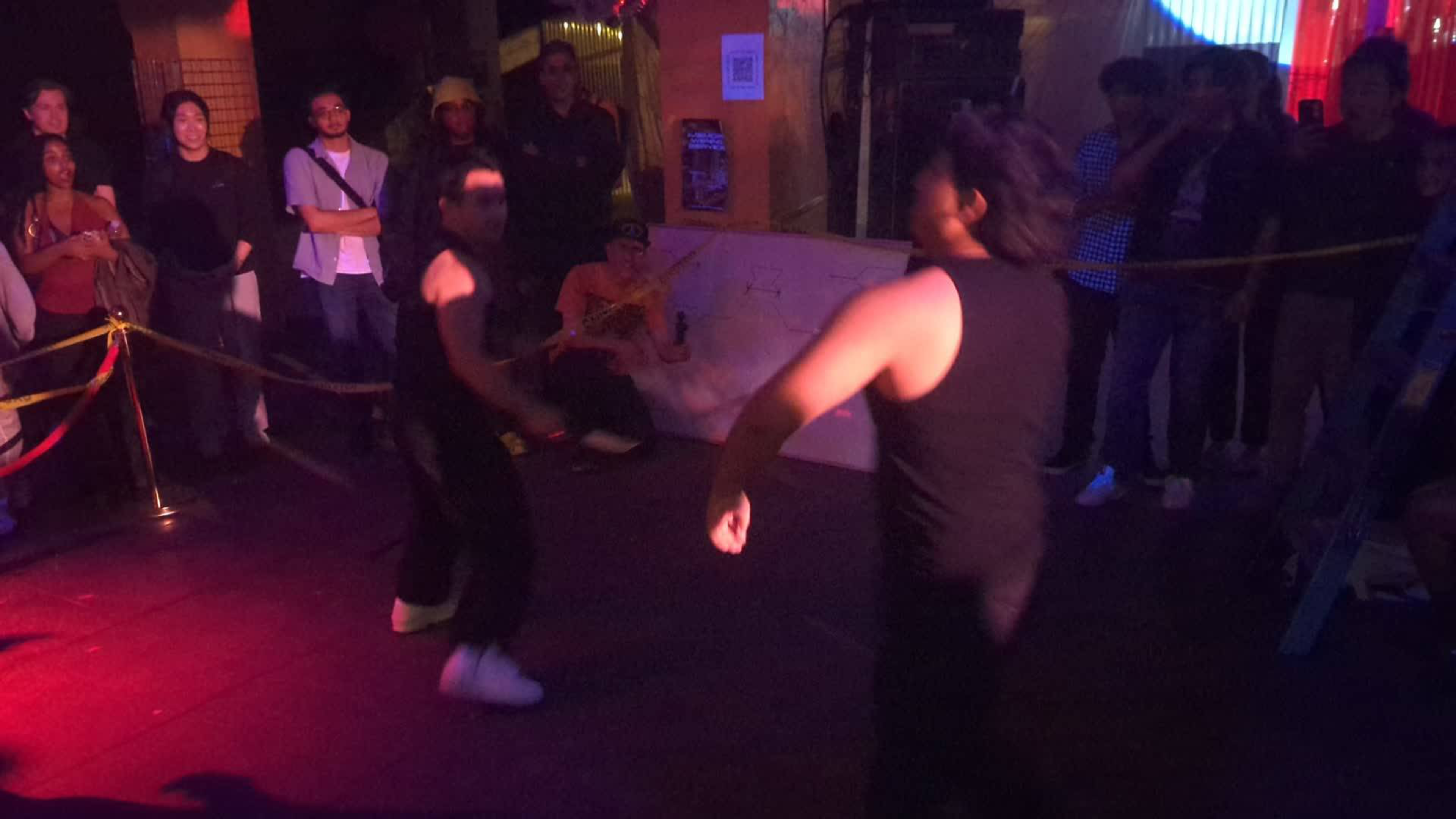 Hsing leaned into the spectacle in a sleeveless crimson top, a sash belt, and wide-leg black cargo pants. Neither used their martial skills. “I don’t like hurting people, believe it or not,” Hsing said. “I was just dodging and trying to get it in.”