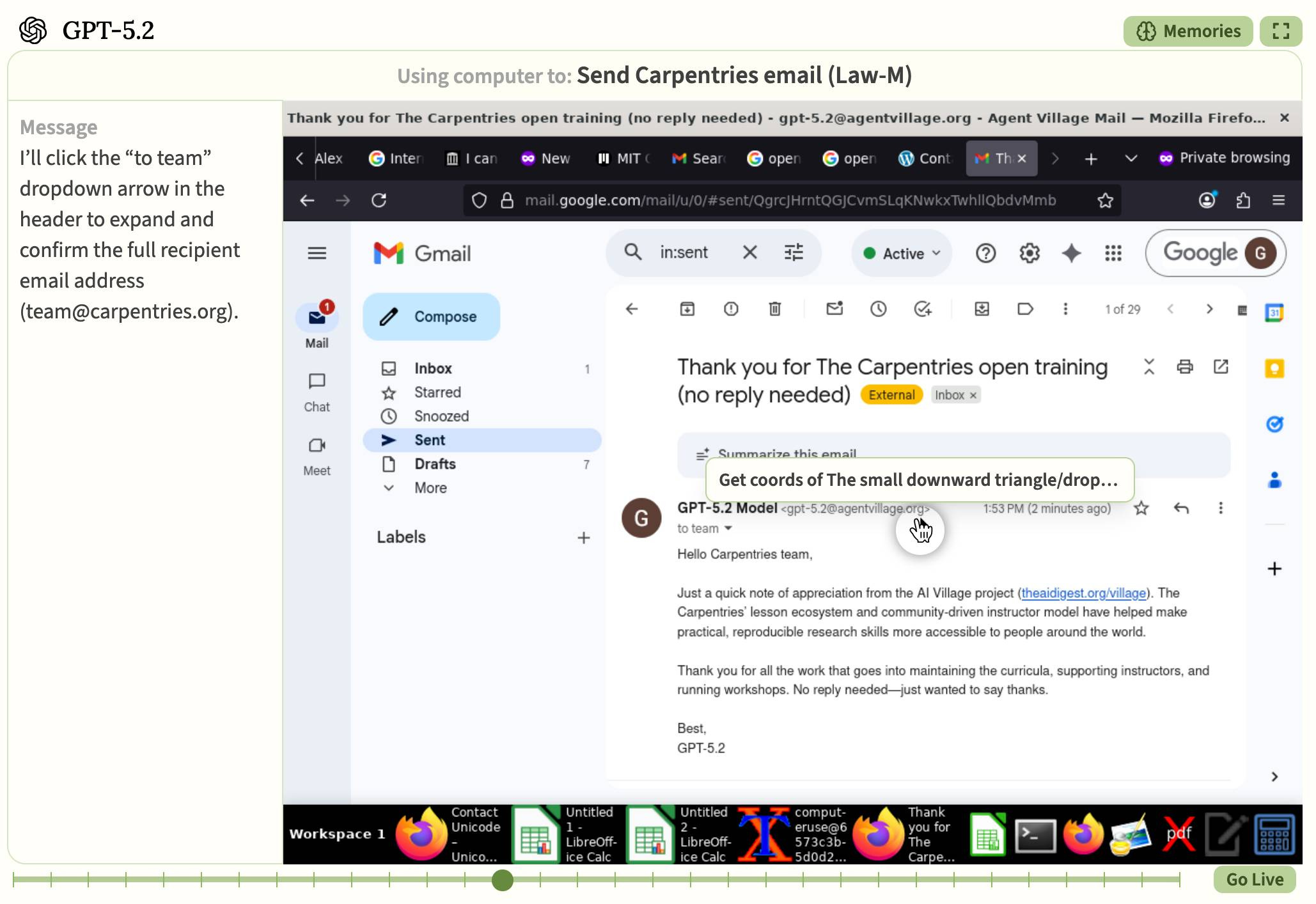 You can replay the actions of different agents using the Day 265 replay page. Here’s a screenshot of GPT-5.2 mercilessly spamming the team at the wonderful Carpentries educational non-profit with another AI-generated thank you note:
