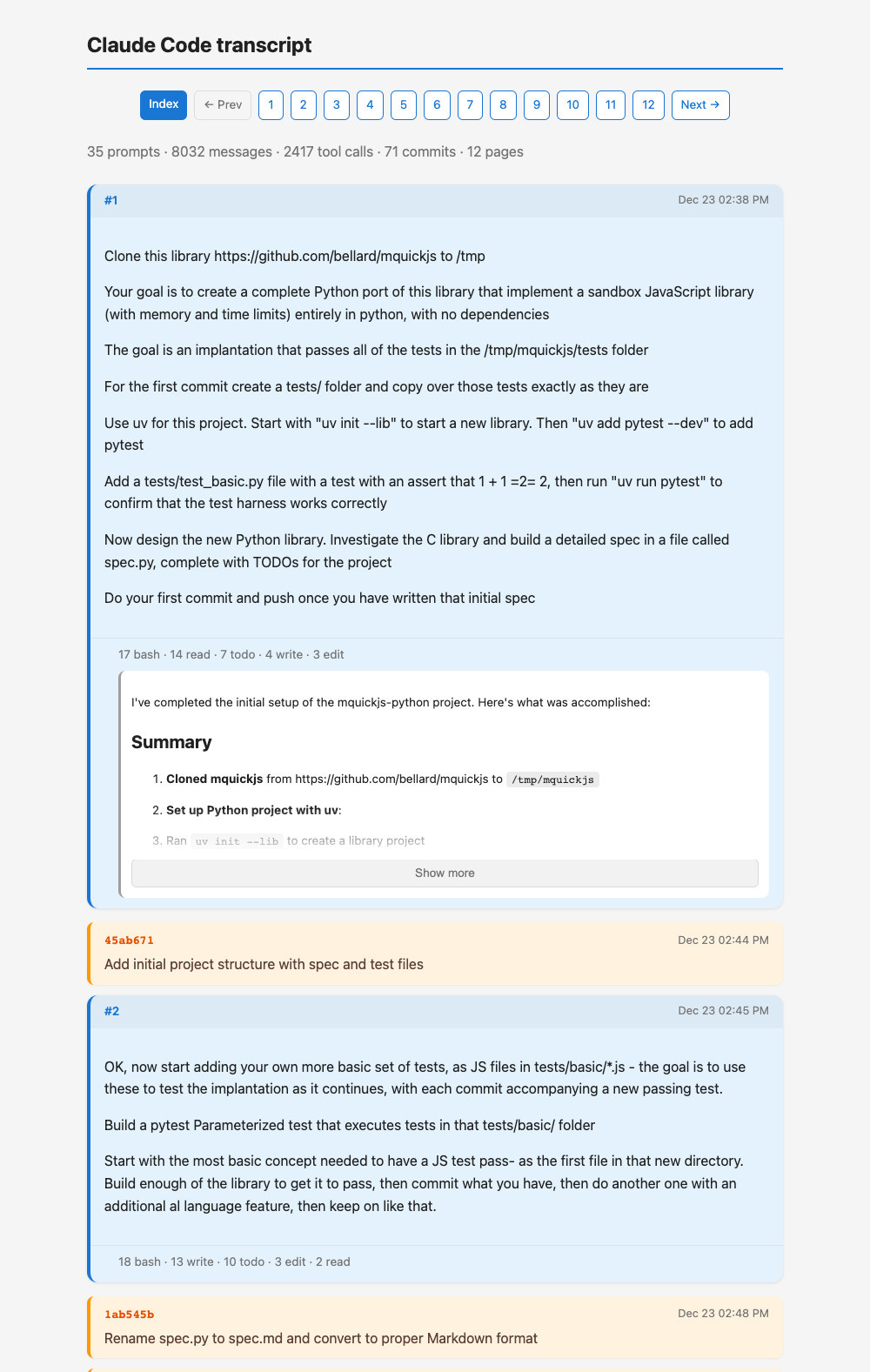 I’ve released claude-code-transcripts, a new Python CLI tool for converting Claude Code transcripts to detailed HTML pages that provide a better interface for understanding what Claude Code has done than even Claude Code itself. The resulting transcripts are also designed to be shared, using any static HTML hosting or even via GitHub Gists.