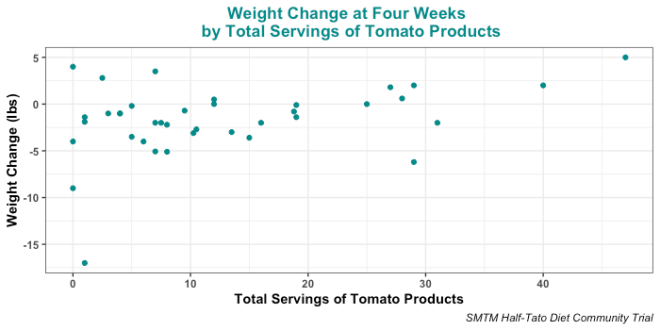 One prime suspect is tomato and tomato products like ketchup. Ketchup came to our attention as a result of some anecdotes from the original Potato Diet Community Trial, stories where people felt that eating ketchup kept them from losing weight. As Jack Peterson noted, tomatoes blocking the effect “would explain why no one ever noticed [the weight loss properties of potatoes] prior to Chris Voigt’s stunt: because potatoes are usually eaten with ketchup”. And we were surprised to see that in the Half-Tato Diet Community Trial, weight loss was correlated with tomato consumption, r(36) = 0.37, p = .021 (also significant when removing the extreme outlier, r(35) = 0.36, p = .031). Plot here: