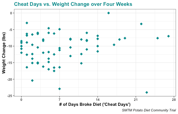 Many people lose weight on the half-tato diet, like M, Nicky Case, Outlier 17, and CuoreDiVetro. We say “half-tato”, even though many of these people were getting less than 50% of their food from potatoes. But when we ran a community trial of the half-tato diet, most people barely lost any weight.