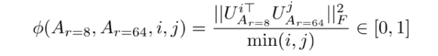 where Ui Ar=8 represents the columns of UAr=8 corresponding to the top-i singular vectors. φ(·) has a range of [0, 1], where 1 represents a complete overlap of subspaces and 0 a complete