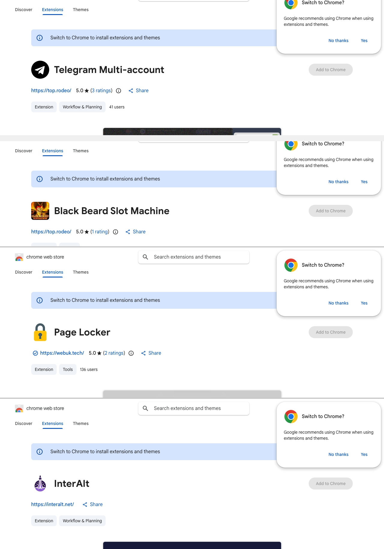 Chrome Web Store listings showing all three developer URLs used across the campaign: https://top[.]rodeo/ (Telegram Multi-account and Black Beard Slot Machine), https://webuk[.]tech/ (Page Locker), and https://interalt[.]net/ (InterAlt).