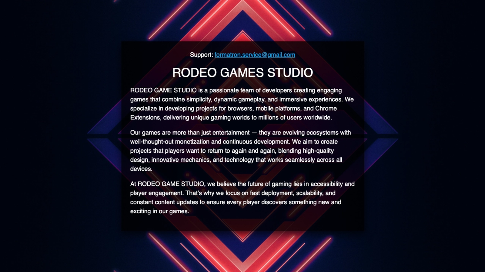 topup[.]cloudapi[.]stream now serves a RODEO GAMES STUDIO about page describing a Chrome Extension monetization business with "well-thought-out monetization" and listing formatron.service@gmail[.]com as a support contact.