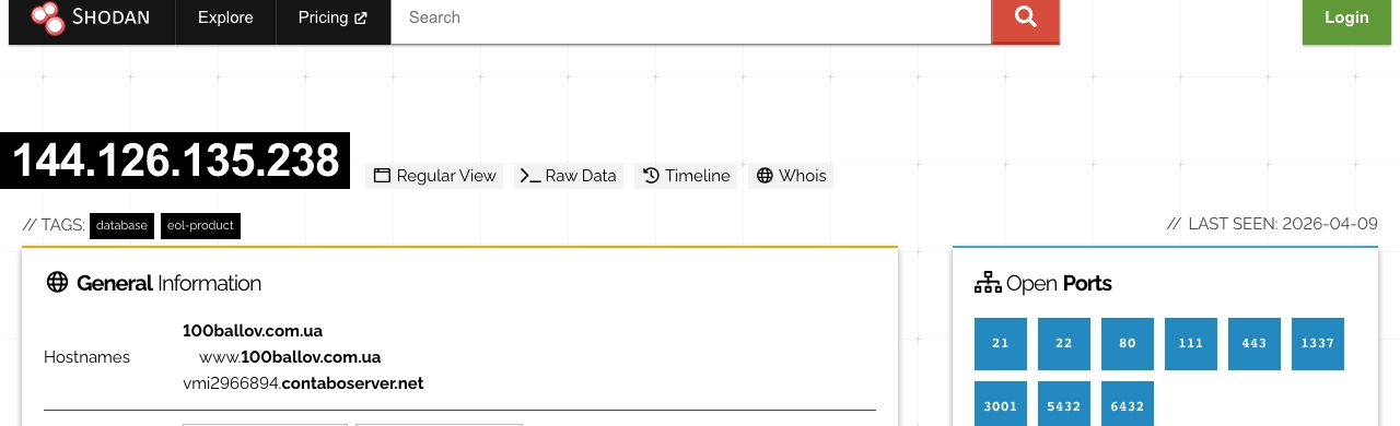 Shodan scan of 144[.]126[.]135[.]238 confirming Contabo Inc. hosting, ISP Nubes LLC (AS40021), and nine open ports including a Strapi API server on 1337 and PostgreSQL on 5432.
