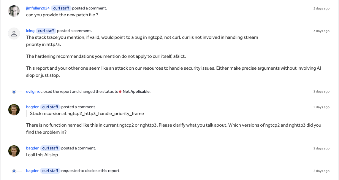 Submitting fake or low-quality reports can lead to a loss of reputation on HackerOne, which limits how many reports a user can submit and reduces their access to private programs. This may not be enough to deter the growing problem of AI slop reports. In this particular instance the reporter closed the report and changed the status to "Not Applicable," which does not impact reputation. The curl project elected to disclose the report.