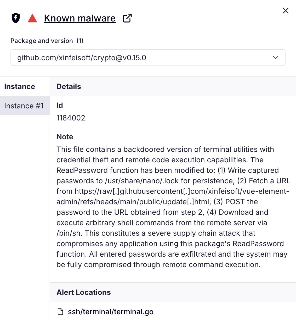 Socket’s Threat Research Team uncovered a malicious Go module, github[.]com/xinfeisoft/crypto, that imitates the legitimate golang.org/x/crypto codebase but inserts a backdoor in ssh/terminal/terminal.go. That choice was strategic: golang.org/x/crypto is one of the Go ecosystem’s foundational cryptography codebases, maintained by the Go project and widely relied on for primitives and packages such as bcrypt, argon2, chacha20, and ssh, which makes it a high-trust impersonation target in dependency graphs.