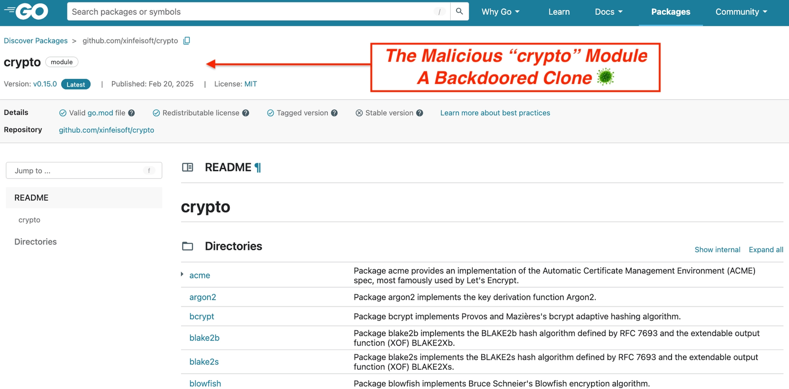 On pkg.go.dev, github[.]com/xinfeisoft/crypto presents as a routine cryptography library with familiar subpackages (acme, argon2, bcrypt, blake2, and others). That lookalike surface helps the malicious module blend into dependency graphs and evade quick visual triage. By copying x/crypto and changing little else, the threat actor reduces obvious anomalies while preserving expected functionality.