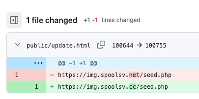 Commit history for vue-element-admin/public/update.html shows that the threat actor updated the GitHub-hosted staging pointer from img.spoolsv[.]net/seed.php to img.spoolsv[.]cc/seed.php, indicating continued maintenance of the delivery chain months after the malicious module was published.