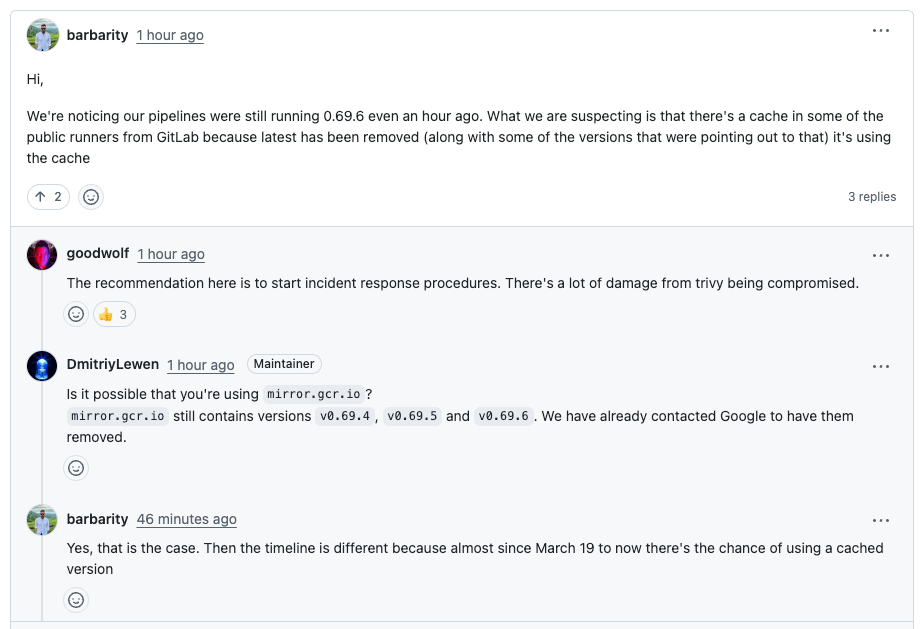 Even after the images were removed, they may have remained accessible through caching and mirror infrastructure. Maintainers noted that mirror.gcr.io continued serving 0.69.4, 0.69.5, and 0.69.6, with reports of pipelines still pulling cached copies.
