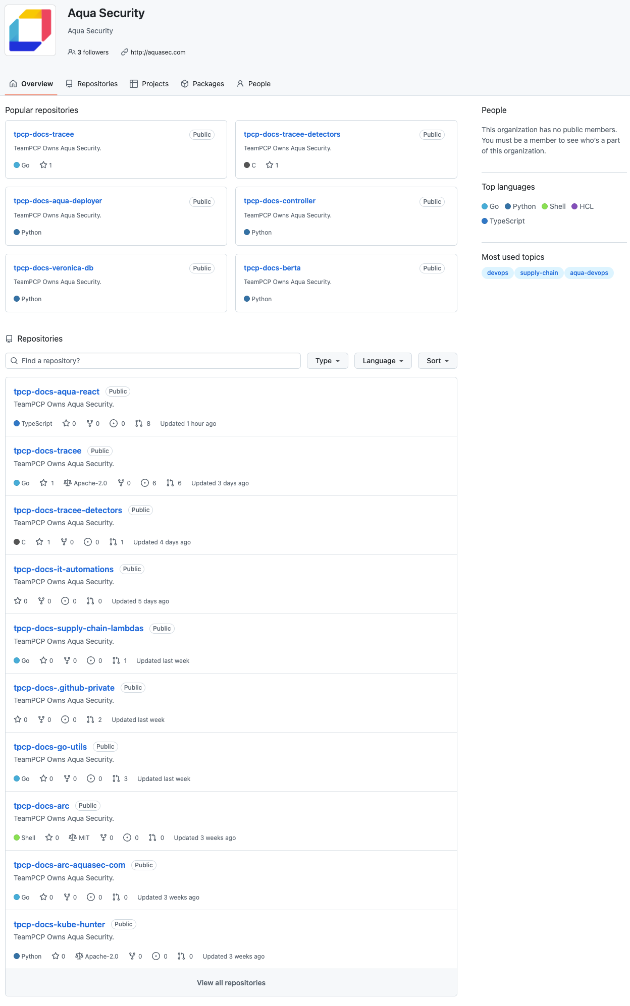 As part of the broader incident, security researcher Paul McCarty noted that the Aqua Security GitHub organization appeared to have been briefly exposed and modified during the attack. Archived snapshots show multiple unauthorized repositories created within the organization, including projects prefixed with tpcp-docs-* and descriptions stating “TeamPCP Owns Aqua Security.” These repositories were publicly visible at the time, suggesting the attacker had sufficient access to create content within the organization, not just read from it. While the full scope of this access remains unclear, the presence of these repositories indicates a deeper level of control over the GitHub organization during the compromise.