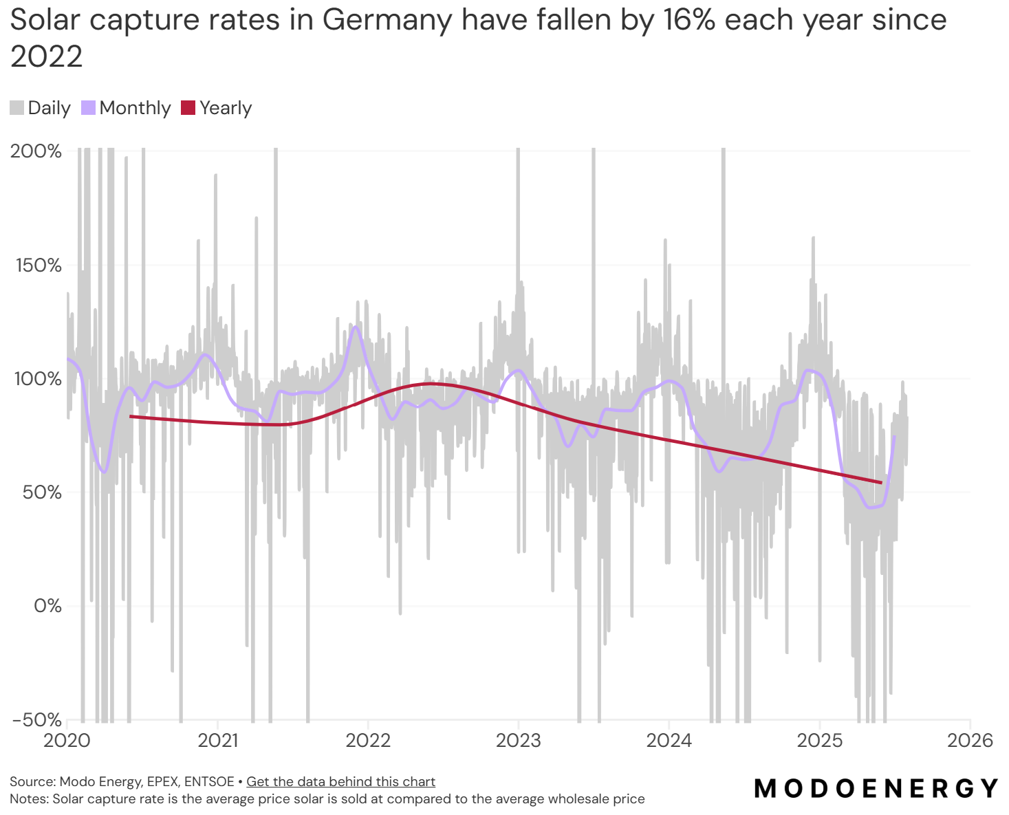 The solar capture rate fell from 98% to 54% in less than three years. The solar capture rate measures the average price that solar generators receive in relation to the average market price.